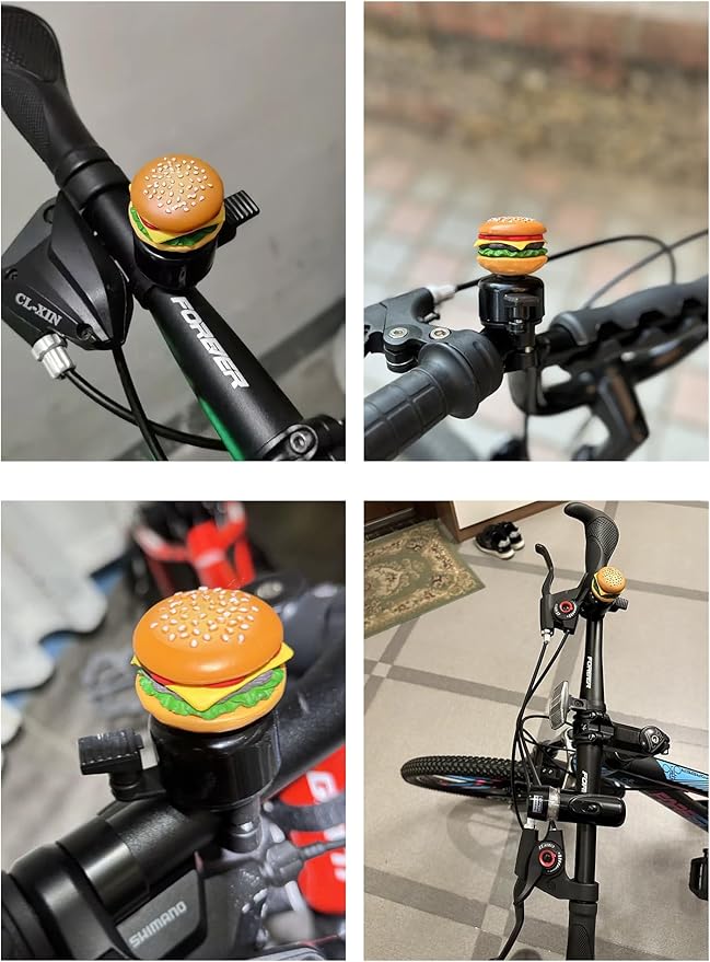 自転車ベル:注意を引くためのクリアで大きなベル音:食べ物の形の自転車ベルは、大きくクリアな音を発し、走行中によく聞こえ、注目されます。このハンバーガー型のベルで、普通の自転車を楽しく目を引く乗り物に変身させましょう。誰もが自転車をクールまたはキュートにドレスアップできる、エキサイティングで遊び心のある方法です。