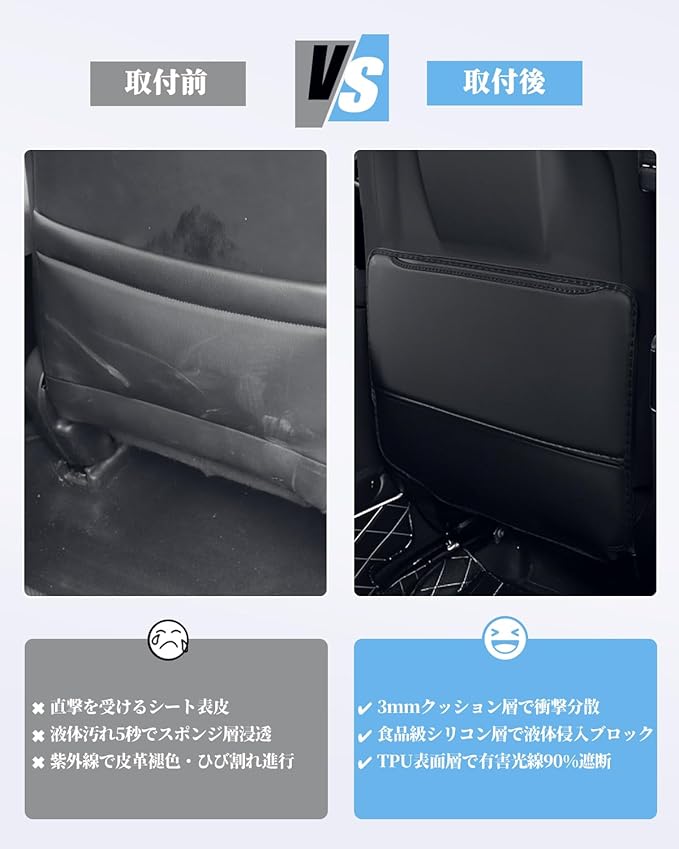 【汚れ防止&収納機能】後部座席のシートバックに取り付けるキックガードで、靴跡や汚れからシートを守ります。特にお子様や乗客がシートを蹴ってしまうことが多い場所に最適!さらに、便利な収納ポケット付きで、携帯電話、タブレット、充電器などの小物をすっきり収納可能。車内が整頓され、より快適に。