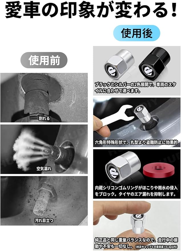 【総合アップグレード】純正品の「割れやすい」「汚れが目立つ」といった弱点をすべて解決。防錆、防塵、気密性向上、防犯機能を一つにまとめた、バルブキャップの理想的な進化形です。シンプルながらも、日々のドライブをより安全かつ快適にする、満足度の高いカスタムパーツです。