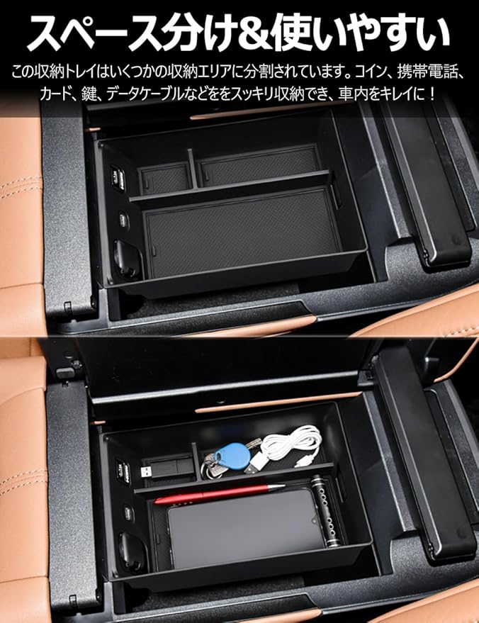 【スペース活用】この内蔵型コンソールボックスはのスペースを最大限に活用できます。データケーブル、コインケース、スマホ、硬貨、カード、鍵などをスッキリ整理。車内の乱れを解消し、整然とした快適なドライブ環境を提供します。