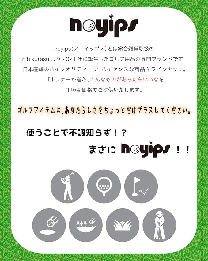 ✅【 noyips 】 総合雑貨ブランドのhibikurasuから生まれた、ゴルフ専門ブランドnoyips(ノーイップス)です。日本基準の検品・販売・管理・発送にて皆様のお手元にお届けいたします。「あったらいいな」ゴルファーの生の声から生まれた商品をラインナップ。