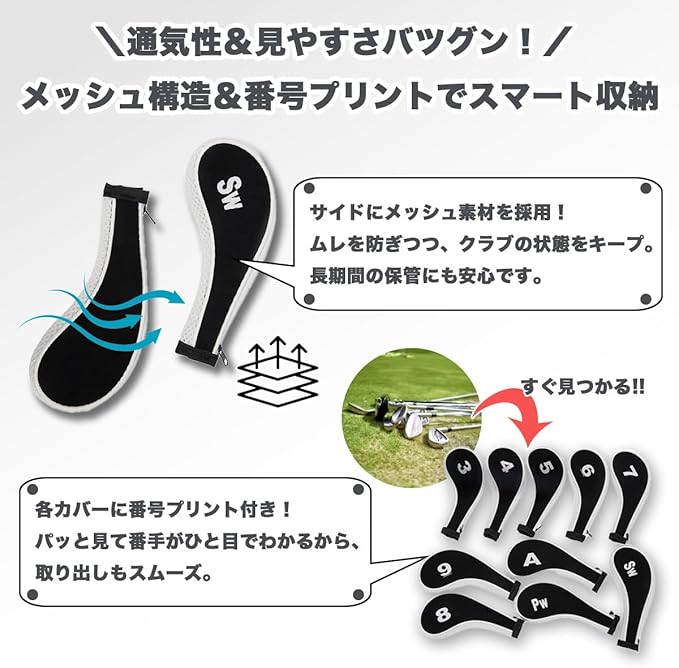 【10個セットでアイアンをフルカバー】このセットには10個のアイアンカバーが含まれており、3番から9番、PW、AW、SWなど、主要なアイアンをすべてカバーできます。統一感のあるデザインで、ゴルフバッグ内が整然とし、見た目も美しくなります。また、セットでの購入によりコストパフォーマンスも高く、初心者から上級者まで幅広くおすすめできます。