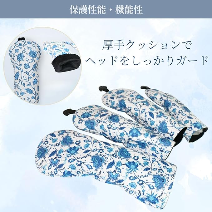 デザイン: 青花模様の美しいパターンが特徴的な4点セットのヘッドカバー。白地に青い花柄が上品な和風デザイン