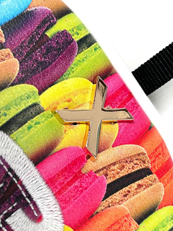 マカロンのカラフルなプリントに刺繍のロゴ。ニコちゃんモチーフのワッペン風刺繍と可愛さ満載のデザインです。