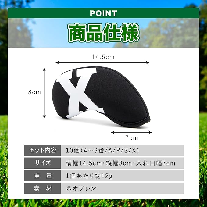本商品はゴルフ用品のセットです。 ネオプレン素材を使用しています。 セット内容:10個(4〜9番、A、P、S、X) サイズ: 横幅 約14.5cm 縦幅 約8cm 入れ口幅 約7cm 重量: 1個あたり 約12g 素材: ネオプレン ※モニター環境により色の見え方が異なる場合があります。