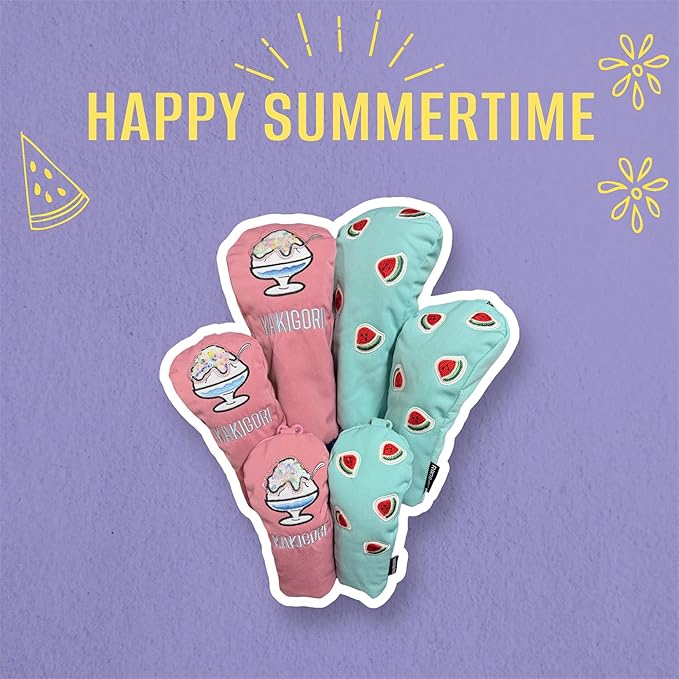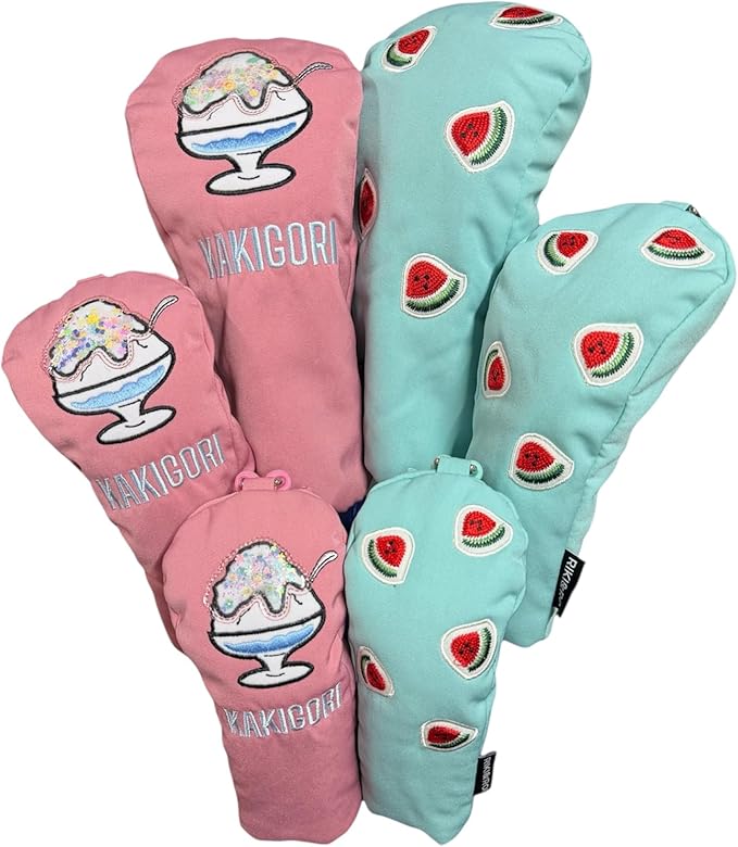 夏のゴルフをもっと楽しく、もっとおしゃれに。 Riki & Roi から、スイカとかき氷をモチーフにした夏限定デザインのゴルフヘッドカバーが登場しました。 鮮やかな水色とやさしいピンクの2カラーに、かわいいスイカ柄とかき氷刺繍をあしらい、見た目にも涼しげな仕上がりに。 ラウンド中にバッグを開けるたび、思わず笑顔になるデザインです。 素材には高級感のあるやわらかい生地を使用し、クラブをやさしく包み込みながらしっかり保護。 内側にはクッション性を持たせ、移動中の衝撃や擦れから大切なクラブヘッドを守ります。 「ゴルフをもっと楽しく」をコンセプトにした Riki & Roi のオリジナルデザイン。 自分用にはもちろん、ゴルフ好きな方へのプレゼントにもおすすめです。