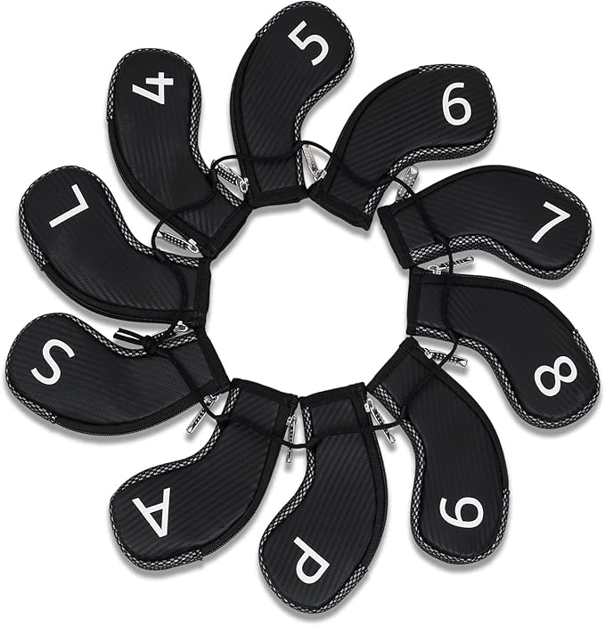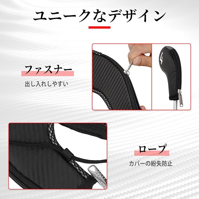 ゴルフアイアンカバー ファスナー開閉 ロープ付 ウェッジカバー クラブヘッドカバー セット 10枚(4-9,P,A,S,L) 黒い合成皮革 新規設計 左右兼用