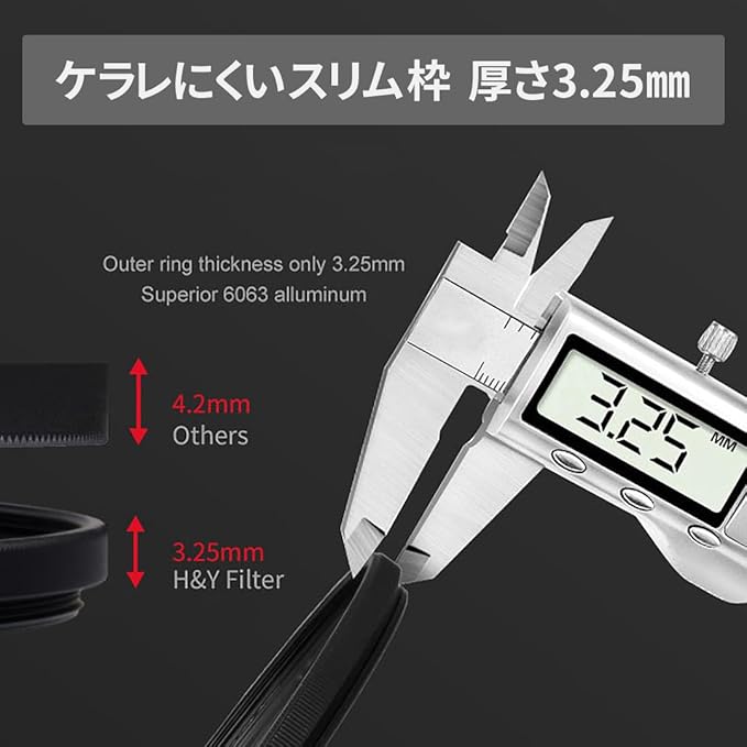 【薄枠3.25mm】広角でもケラレにくくレンズに溶け込む3.25mm薄枠仕様。フレーム前面のローレット加工で着脱をサポートします。前面は通常のフィルター用ネジ枠で、市販のレンズキャップ等が取付可能です。