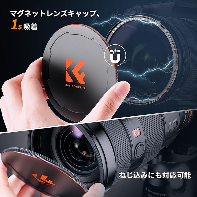 【2 in 1機能】磁気吸着とネジ付きを1つに凝縮した1枚二役レンズキャップです。マグネットレンズキャップを装着すると、簡単かつ快速にレンズをカバーできてしっかりと貴重なレンズやレンズフィルターを守れます。