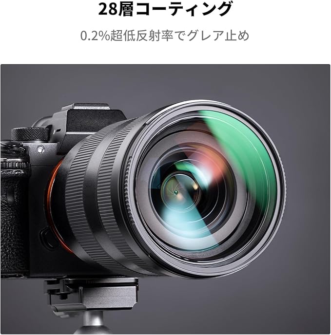 【多層コーティング】フィルターは高品質光学ガラス、両面多層コーティングでフィルター表面の反射光を効果的に減らすことができます。優れた撥水・撥油・傷防止28層コーティングが施され、水滴や汚れが万一付着しても簡単に拭き取りが可能です。