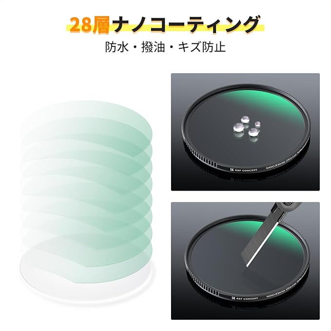 【28層コーティング】レンズフィルターは高品質光学ガラス、両面28層コーティングでフィルター表面の反射光を効果的に減らすことができます。優れた防水・撥油コーティングがされており、皮脂や汚れがつきにくく、落ちやすくなっています。表面硬度は9Hで衝撃を受けても割れません。