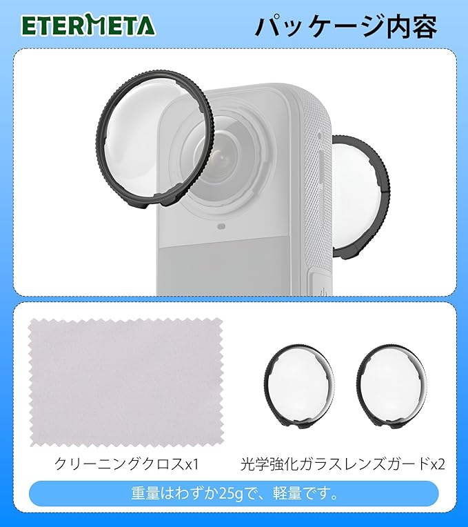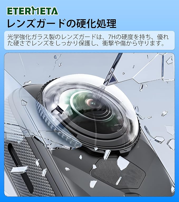 商品仕様 レンズガードは光学強化ガラス素材を採用し、アクションカメラのレンズにぴったりフィットします。重量はわずか25gで、レンズガードを取り付けた状態でもカメラが軽量です。パッケージ内容:光学強化ガラスレンズガード 2、クリーニングクロス 1。