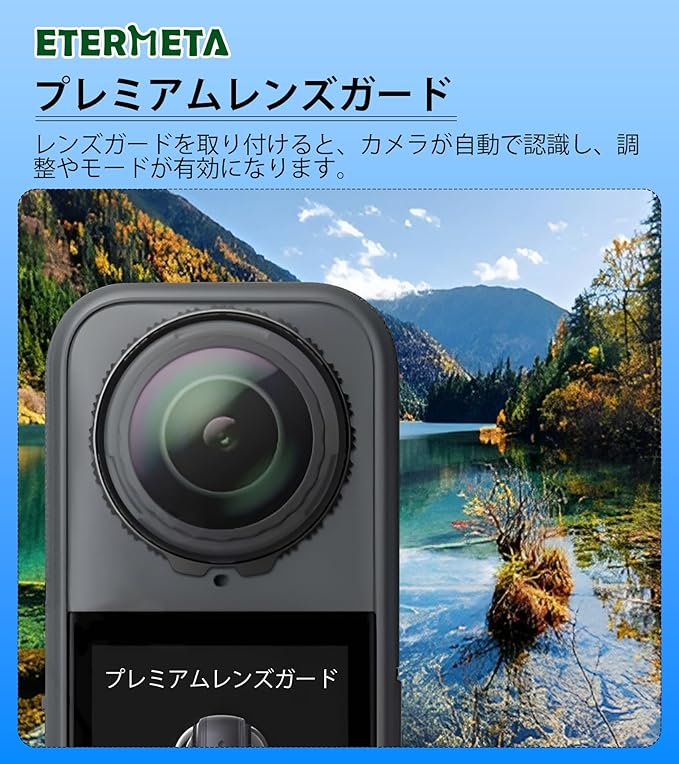 パノラマ補正と自動認識 レンズガードはInsta360 X5カメラ専用に設計されています。レンズガードが取り付けられると、カメラは自動的にそのレンズを認識し、適切な調整や特定のモードを自動的に有効にします。