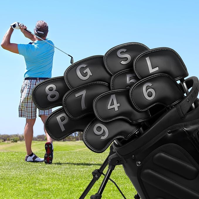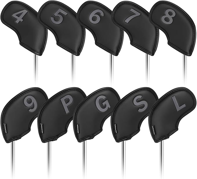 ゴルフアイアンカバー ウェッジカバー クラブヘッドカバー セット 10枚(4-9,P,G,S,L) 黒い合成皮革 新規設計 左右兼用