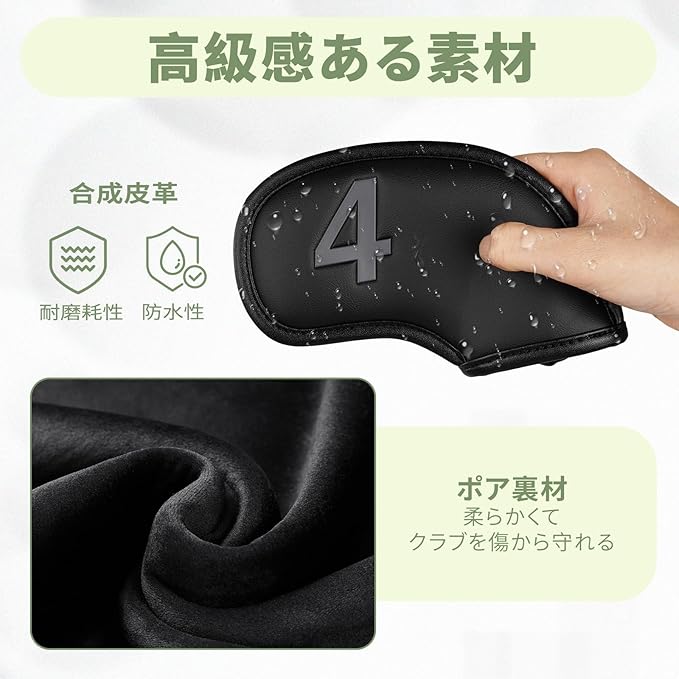 【高級感のある素材】表生地は高級感のある合成皮革(PUレザー)なので、耐磨耗性、防水性があります。裏生地はポリエステル製柔らかいボア素材になっていますので、大切なクラブヘッドを傷や汚れから守ります。
