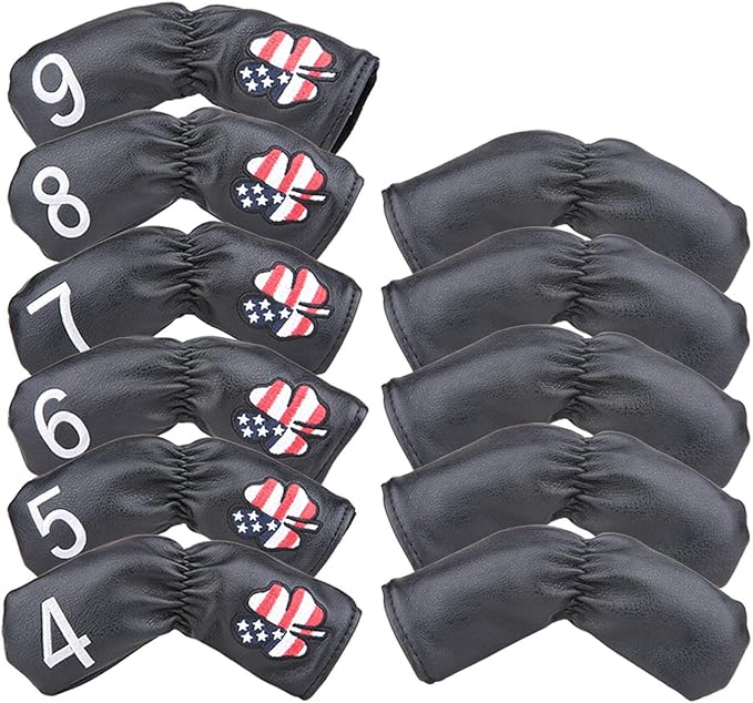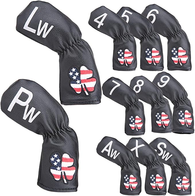 高級pu革 アイアンカバー クローバー usa 米国旗 11点セット 防水 4番~9番 AW PW SW X 番手付 黒