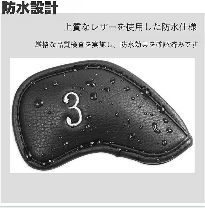 【高級感と保護性能】このゴルフアイアンカバーは、耐磨耗性と防水性に優れた高級感のある合成皮革(PUレザー)を使用しています。内側は柔らかいポリエステル製ボア素材で、大切なクラブヘッドを傷や汚れからしっかりと守ります。これにより、クラブの寿命を延ばし、常に最高のパフォーマンスを発揮できます。