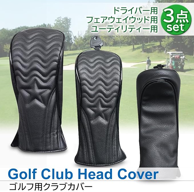 カラー:ブラック 素材:PUレザー 3点セット:ドライバー用・フェアウェイウッド用・ユーティリティ用 各1点