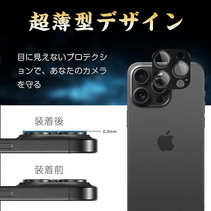 iPhone 16 Pro / 16 Pro Max 対応 カメラ保護 ガラスフィルム 硬度9H 強化ガラス アイフォン16 プロ / 16 プロMax カメラレンズプロテクター 衝撃吸収 飛散防止 全面保護 黒縁取り 露出オーバー防止 アルミ合金 カメラカバー 高透過率 自動吸着 気泡ゼロ 汚れ防止 貼り付け簡単(2枚セット)(ブラック)