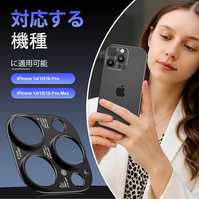 完璧なフィット感、超薄型 iPhoneカメラレンズの1:1外観デザインにより、iPhone 16 Pro Max/16 Pro/15 Pro Max/15 Pro/14 Pro Max/14 Proに完璧にフィットします。薄くて軽量で、取り付け後の高さはオリジナルよりわずか0.12mm。独自の段差デザインにより、最大限の保護を確保しつつ、ほとんどの保護ケースとの互換性を維持します。