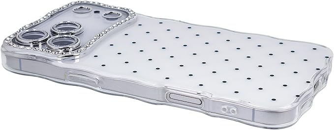 iPhone17 Pro対応ケース、かわいいポルカドットデザイン、取り外し可能なダイヤモンドカメラレンズガラスプロテクター、6.3'' - 白