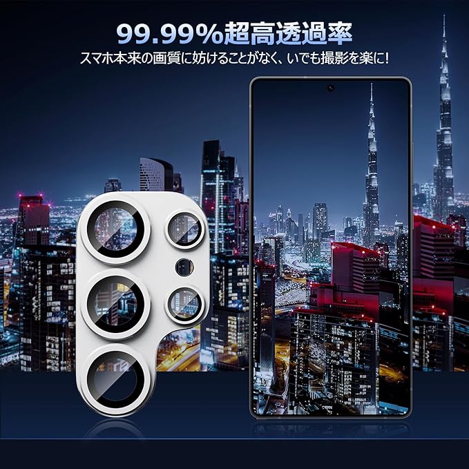 【対応機種】Samsung Galaxy S25 Ultra専用レンズカバー。素材:アルミ合金+9H強化ガラス。日本旭硝子製・傷がつきにくい