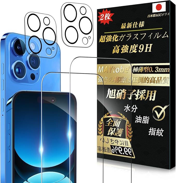 【ガラスフィルム 4枚セット】MAYtobe ガラスフィルム iPhone 15 Pro 用 ガラス保護 カメラレンズプロテクター 日本製旭硝子 【2枚液晶保護+2枚レンズ保護】 全面保護 硬度9H 耐久性 極薄 99%高透過率 保護フィルム 液晶 耐衝撃 気泡なし 指紋防止 飛散防止 撥水撥油 自動吸着 貼り付け簡単 3Dタッチ いphone15Pro 対応 保護フィルム ガラス