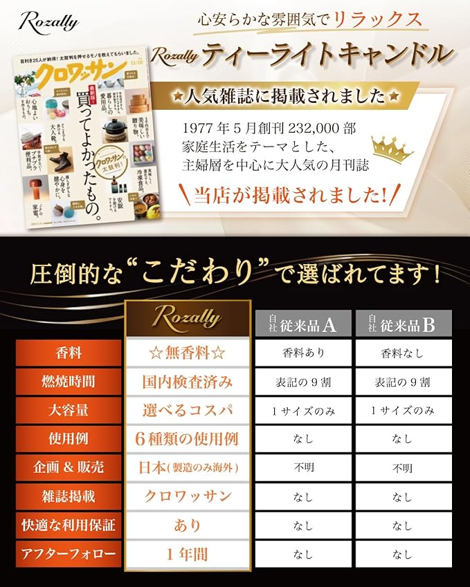 【製品サポート】 Rozally ティーライトキャンドル は品質にこだわり、工場と交渉をおこなって素材選定から進めています。輸送中に破損や汚れの付着など稀に発生してしまうケースがあります。不具合などが発生してしまった場合でも、すぐに交換品の手配をさせて頂きます。