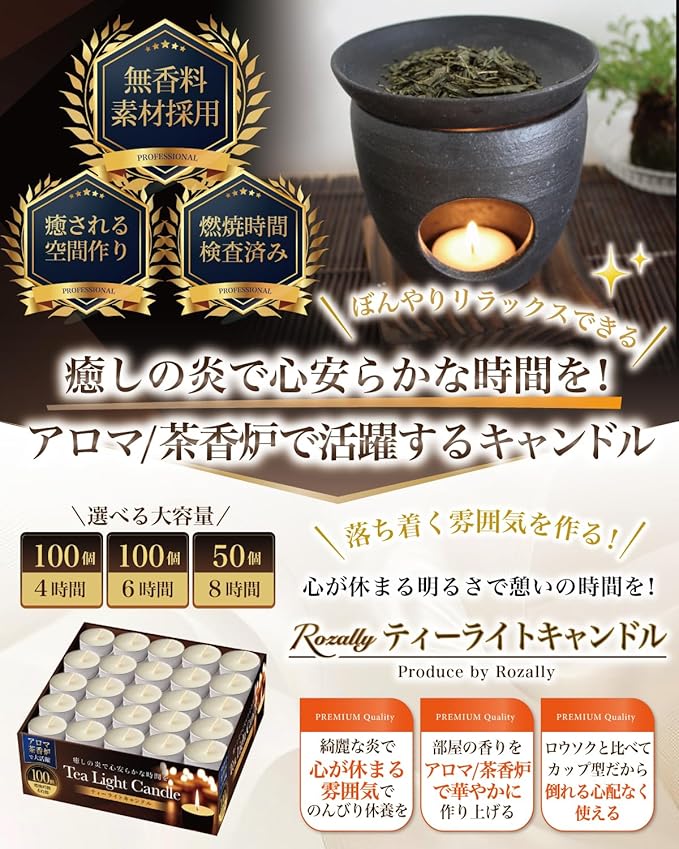 【心安らかな時間を作る】 Rozally ティーライトキャンドル ( ティーキャンドル ) がついに販売開始。 「アロマ用に無香料のキャンドルが欲しい」「茶香炉にハマって消費量が増えた」という お客様に人気の大容量の ティーライト キャンドル [アルミカップ] です。 「リラックスタイムで心安らかな時間を…」「儚げな炎の中で癒されたい…」 そんなお客様の声から生まれたティーライトキャンドルです。