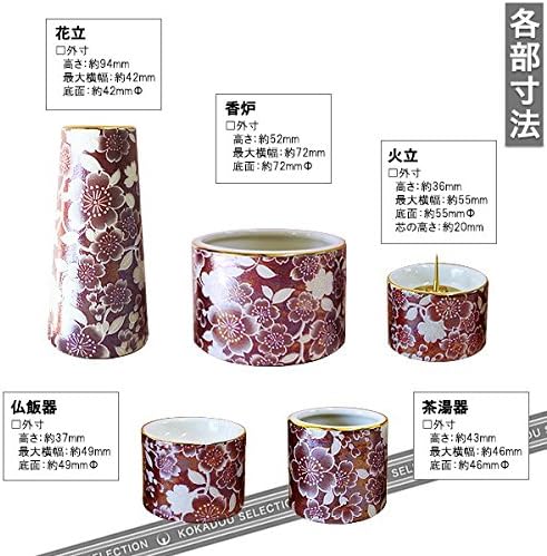 サイズ(㎝) 湯呑:高4.3 径4.4 仏飯器:高3.6 径4.8 ローソク立:高3.6 径5.4 花瓶:高9.3 径4.1 香炉:高5.2 径7.2
