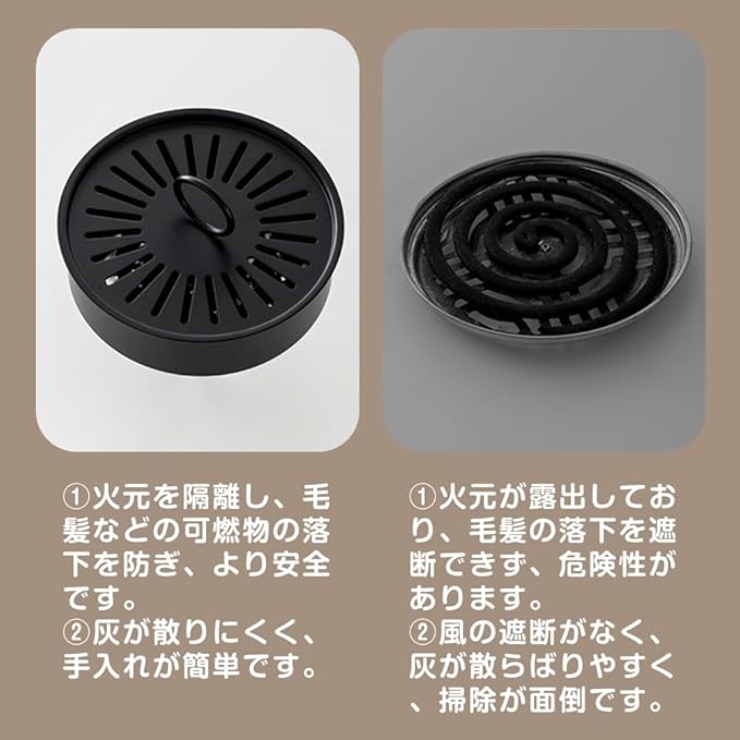 【優れたデザイン】香炉やお香からの火災を防ぐ蓋付きデザイン。蚊取り線香の挿入が簡単で、滑り止めデザインで安全に使用できます。