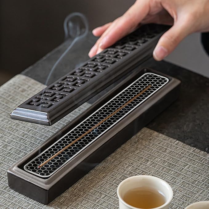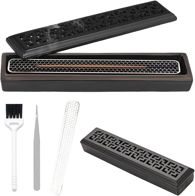 お香立て 横置き香炉 香炉 横置き 仏壇/茶道用品/香道用/料亭用 蓋つき 線香皿 難燃綿付き 瞑想 睡眠 ヨガ スパ ルーム装飾用 おしゃれ 和風 安全 香道用 (ブラック)