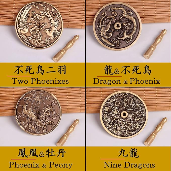 香炉灰や火鉢などの灰を平らに整える香灰ツール灰押さえです。銅に聖獣を彫刻したアンティークな灰押さえは、香道や法要など静穏な雰囲気をより高尚に演出します。不死鳥二羽、龍&不死鳥、鳳凰&牡丹、九龍、4種のデザインをご用意いたしました。