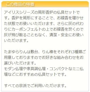 ■セット内容 <アイリス 筒型香炉> 〈仏器〉ご飯を入れていただくお皿が取り外すことが出来てお手入れも簡単で便利です。〈茶湯器〉 お水(またはお茶)をお供えしていただきます。お水を入れる部分が取り外すことが出来てお手入れも簡単で便利です。〈花立て〉お花をお供えしていただく仏具です。〈前香炉〉 お線香を焚いていただく仏具です。〈火立て〉ローソクを立てていただく仏具です。 (たまゆらりんセット) たまゆらりん(クリアー 1.8寸)とりん棒、りん台のセットです。 りん棒とりん台はそれぞれ3色の中からお好みの色をお選びいただけます。