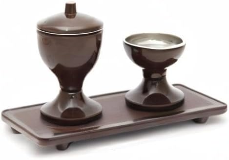 創価学会 ミニ仏壇専用 高音が心地よく響く 錆びないリン 水入れ ご飯入れ お盆 花瓶 シキビ造花 電気ろうそく 角香炉 灰付き 9点セット 茶