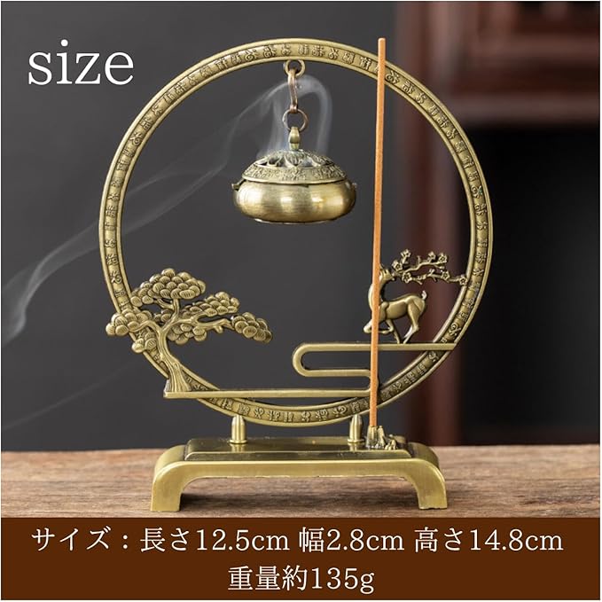 【商品仕様】 ●商品名:銅製お香立て 鹿と松モチーフ ●サイズ:約 12.5cm 4.0cm 高さ15.5cm(※参考) ●材質:本体・台座:銅合金(真鍮調) ●重量:約140g前後 ●付属:吊り香炉パーツ(取り外し可) ●香タイプ対応:スティック香、円錐香(コーンタイプ) ●用途:インテリア香炉、空間演出、ギフト、仏具、ヒーリング雑貨