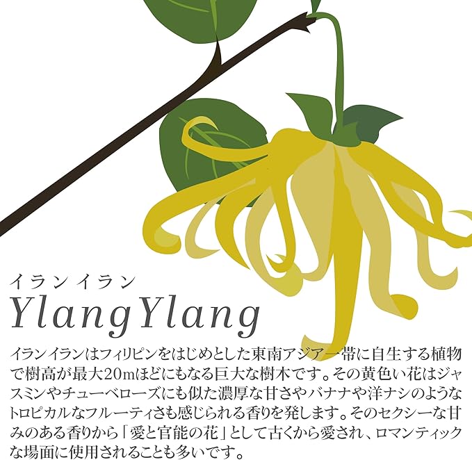 【イランイラン】フィリピン・ダガログ語で「花の中の花」の意味を持つイランイランは甘く濃厚な香りが特徴です。フローラルノートやオリエンタルノートという香りの種類に当てはまり、少しミステリアスな印象を受けます。「官能的な香り」「東洋的な香り」と表現されることもあり女性に人気な香りです。