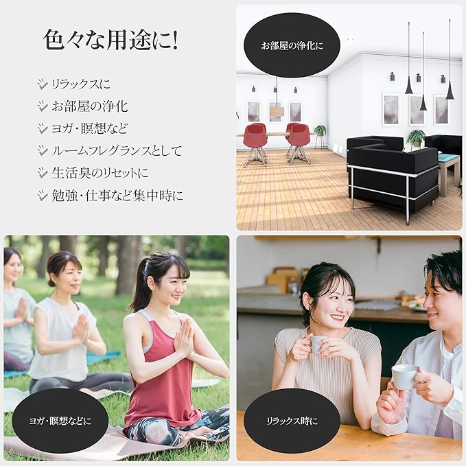 【おすすめ用途】リラックス / 空気リセット / 就寝時 / 勉強時 / 集中時 / デスクワーク / ヨガ / アロマセラピー / 生活臭防止