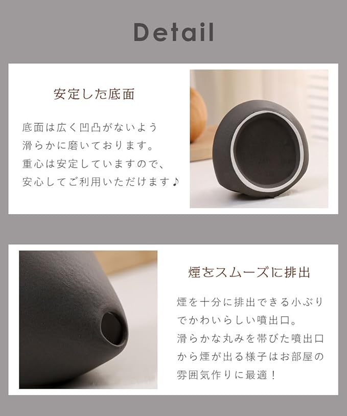 セラミック素材ならではの風合いとしっとりした質感が心地いい、リラックスムードを演出します。 素材特有のむらや小さな凹凸感がひとつひとつ個体によって違うのも魅力ポイント。