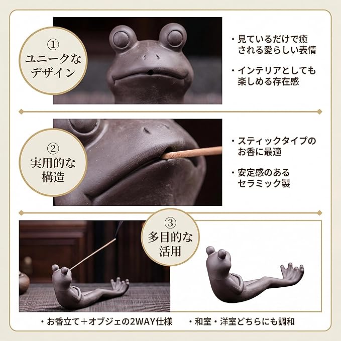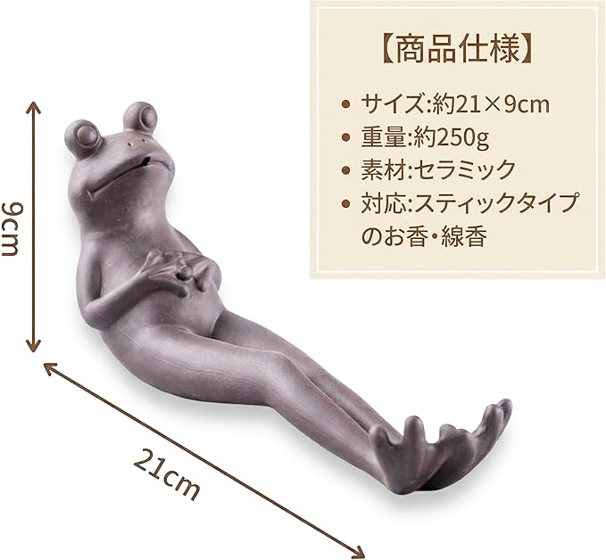 【癒しのカエル香立て】 口元にお香をくわえたユーモラスな表情が魅力の「カエル お香立て・線香立て」。スティックタイプのお香・線香を差し込むだけで、ゆらゆら立ち上る煙を眺めながら心からリラックスできる癒しの時間をお楽しみいただけます。インセンスホルダーとしても抜群の存在感です。
