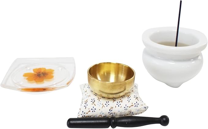 仏具 季節の供物皿 押し花 12ヶ月 花言葉 おりん 香炉 ミニ仏具セット (7月キバナコスモス)