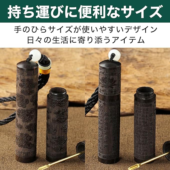 持ち運びに便利なサイズ感:この塗香入れは、長さ約8.9cmという手のひらサイズが使いやすいデザインです。外出先でも使いやすい形状が魅力で、黒檀素材特有の落ち着いた質感が塗香を使うシーンを上品に彩ります。日々の生活に寄り添うアイテムです。