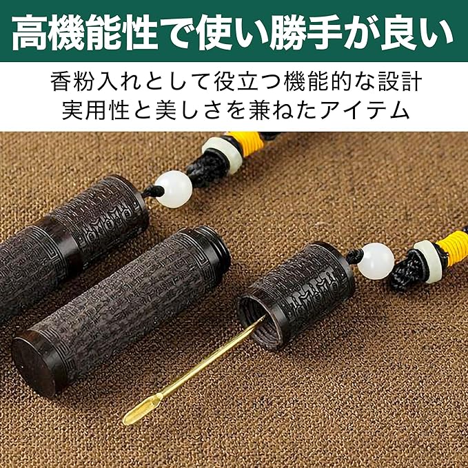 機能性が高く使い勝手が良い:フタの内側に薬さじがセットされているため、必要な量をスムーズに取り出すことができます。内径約1.1cmの収納スペースが使い勝手の良さを実現しており、香粉入れとして役立つ機能的な設計です。実用性と美しさを兼ねた商品です。