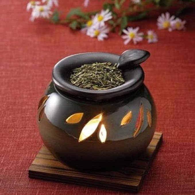 お茶葉を本体の皿の上に置き、それを下からアロマ 用のロウソクで、熱することで、お茶葉の香ばしい、かおりの空間を造ります。 煎茶、番茶など日本茶だけではなく、アップルティ、 ハーブティ、コーヒー豆なども試していただくのもいい でしょう。