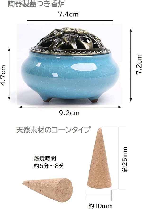 【COOLPIPIT】 香炉/お香セット アンティーク おしゃれ 陶器 ヨガ インテリア 渦巻き/線香/コーン型対応 線香立て 不燃布 コーン混合200個入り 4点セット (ブルー)
