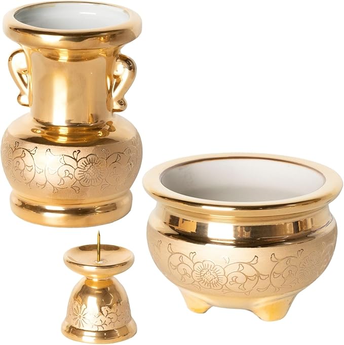Ceramic Arte (セラミックアルテ) 仏具 金唐草 (香炉&ロウソク立て&花瓶)3点セット 陶磁器 仏壇 お茶 お供え ゆのみ ミニ 本金焼き付け 日本製