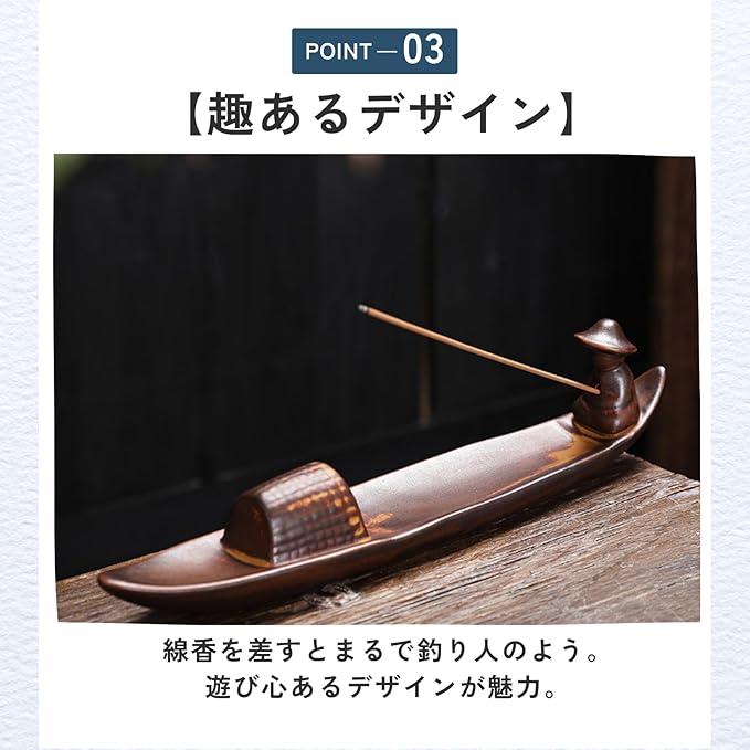 【商品特徴】レトロな陶器製線香立てで、日常にほっとする癒しの時間を。【インテリア性】和の趣が漂う笹舟型。飾るだけで空間に静かな風情を添えます。【趣あるデザイン】線香を差すとまるで釣り人のよう。遊び心あるデザインが魅力。【使いやすさ】シンプルで灰の処理も簡単。実用性と美しさを兼ね備えています。