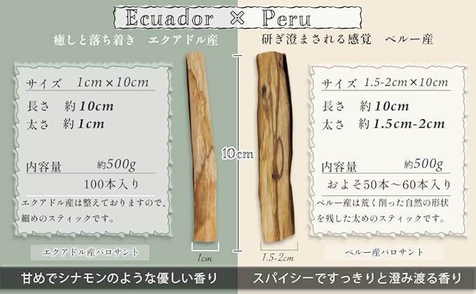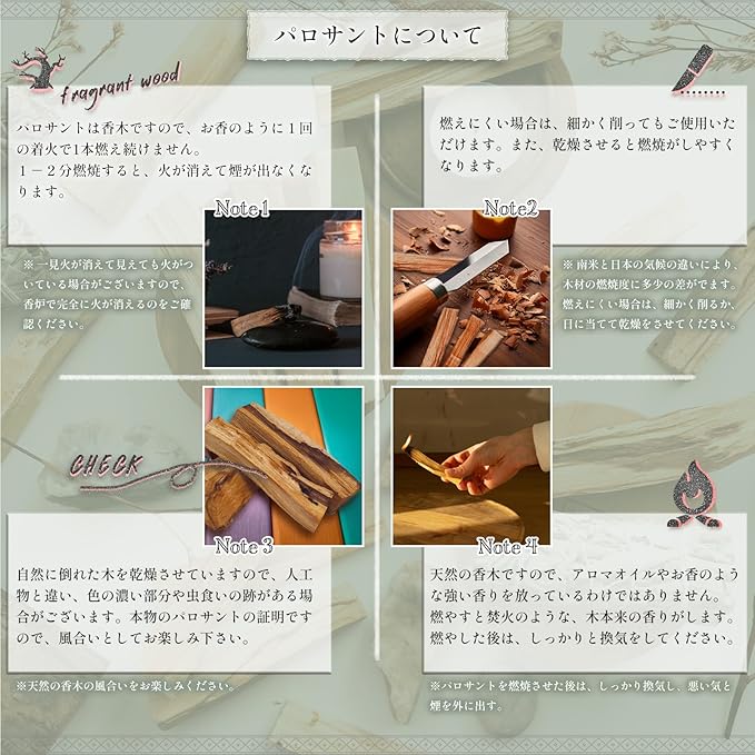 【製法】 木を圧縮することで油を分泌し芳香を獲得。収穫した木は3〜4年間収集されないままにして、自然を破壊しないよう保全しています。パロサント農場から直接仕入れ、日本国内で検品・パッケージしております