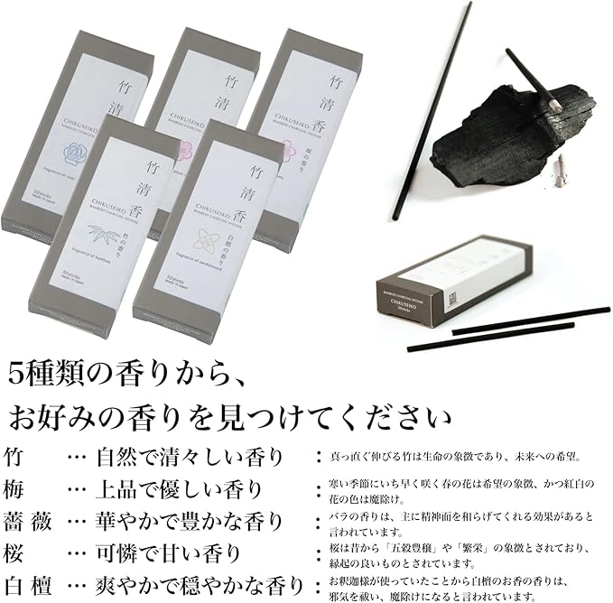 「天然の香り」:竹清香は、100%天然の成分で作られています。 竹を炭化する工程で出来る竹酢液と竹炭を主な原料として、植物から抽出した天然 の消臭剤と香料を使用しています。 自然のものだけで作られた、安心できる優しい香りです。