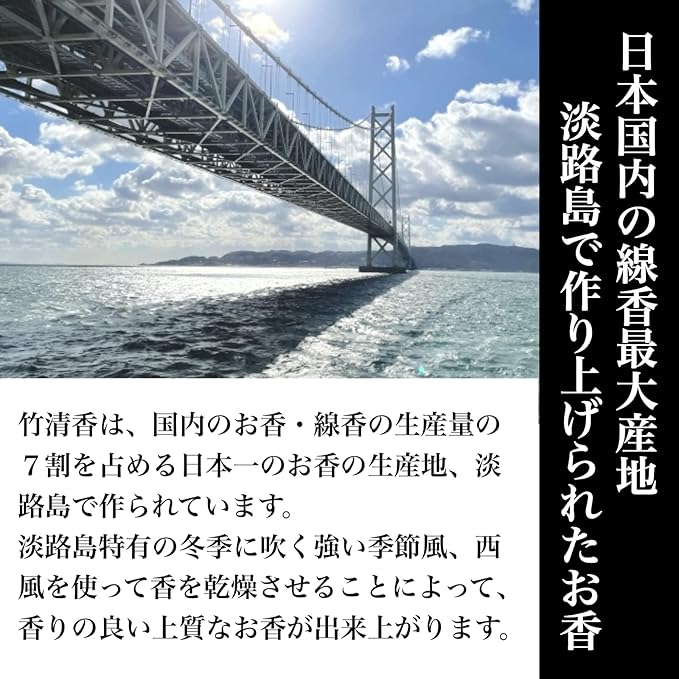 「淡路島のお香」:竹清香は、国内のお香・線香の生産量の7割を占める日本一のお香の生産地、淡路 島で作られています。 淡路島特有の冬季に吹く強い季節風、西風を使って香を乾燥させることによって、 香りの良い上質なお香が出来上がります。